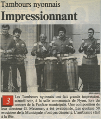 Fondée le 3 janvier 1917 au Café du Saumon et avait pour titre » Société des Tambours de Nyon », les tambours se sont produit tout d’abord avec des clairons dans un uniforme napoléonien.Les années passant, les clairons disparurent, mais dès 1925 une classe de jeune fifres vint renforcer les rangs pendant une dizaine d’années. Puis les tambours continuèrent seuls leur chemin sous la direction de Walter Furrer qui développa le tambour bâlois et offrit deux titres de Champions Romands à la société, en 1967 et en 1971. Au milieu des années 1970, un nouveau groupe de fifres se forma sous la direction de Marlyse Blanc.